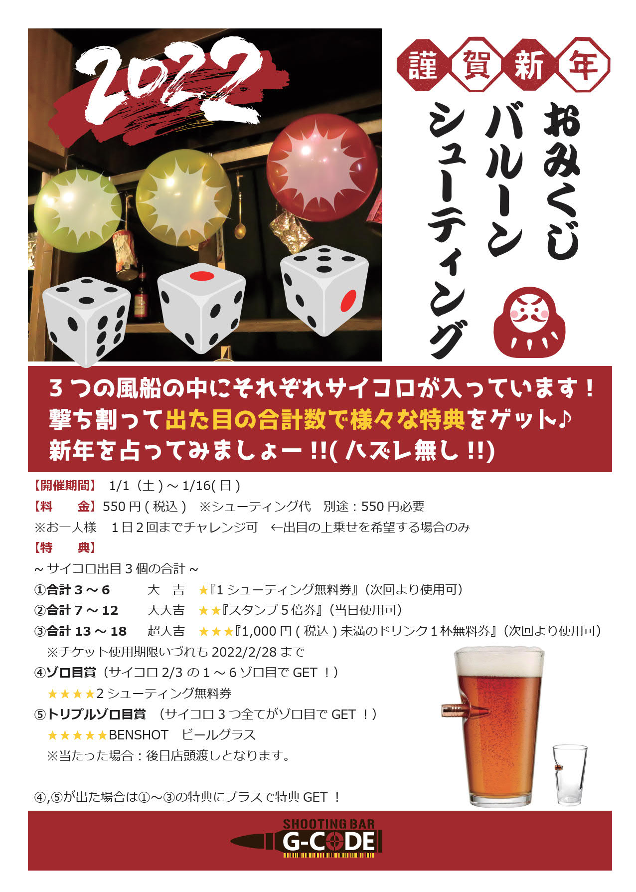 3つの風船に入っているサイコロの出目に応じて様々な特典がGETできちゃいますので新年の運試しにぜひ!