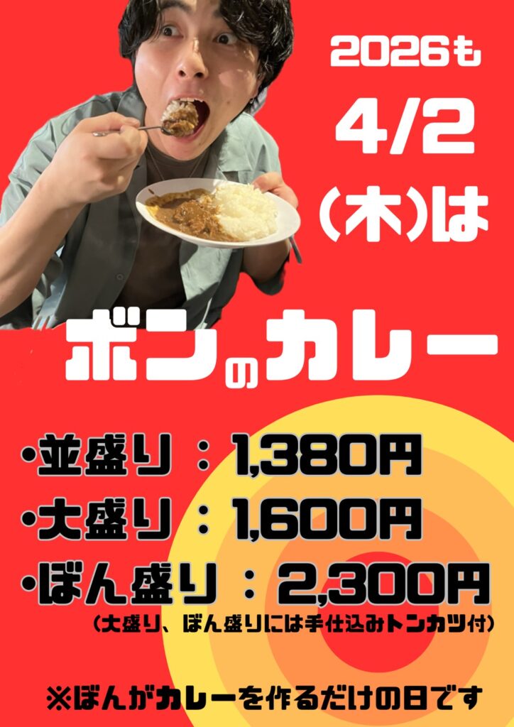 今年も美味しいカレーをご提供します!大盛りとぼん盛りには手仕込みとんかつがついてきます!
