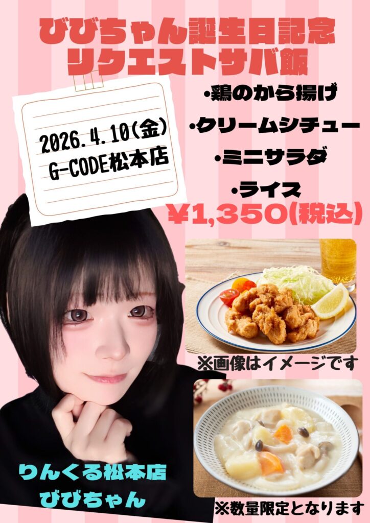 イベント自体はりんくるカフェで行いますが、G-CODE松本ではびびちゃんが好きなお料理をご提供します!