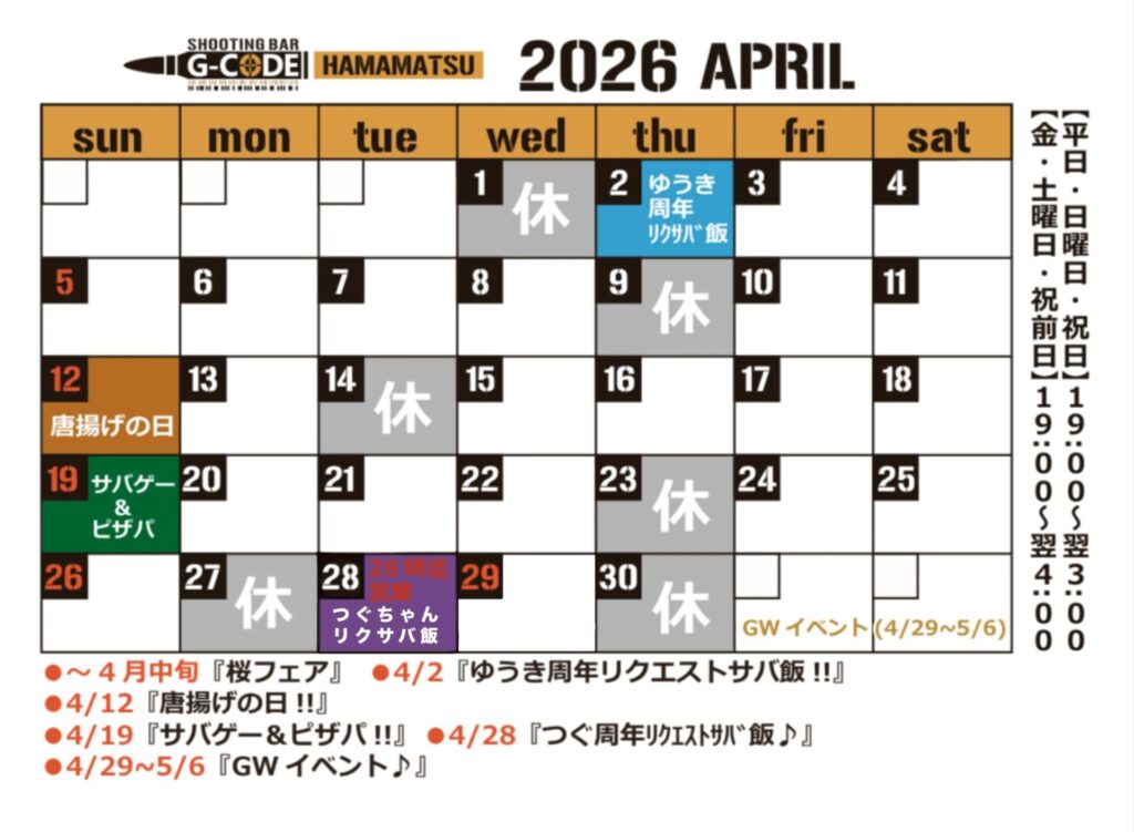 G-CODE浜松店4月のイベントカレンダーです!